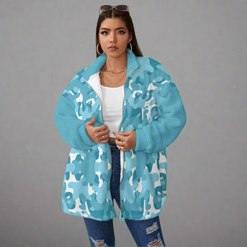 Cammo Game Light Blue Fleece Stand-up Collar Coat With Zipper Closure