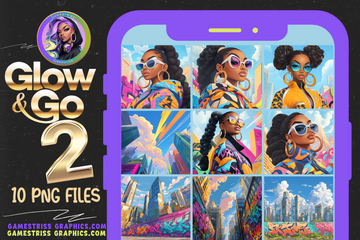 Step into bold luxury and unapologetic confidence with the Glow & Go 2 Digital Art Collection. This stunning bundle includes 10 high-resolution PNG files designed to elevate your creative projects with fashion-forward energy and modern glam. Featuring 5 unique character illustrations and 5 separate background images, this collection delivers everything you need to create impactful designs with an urban-chic aesthetic.