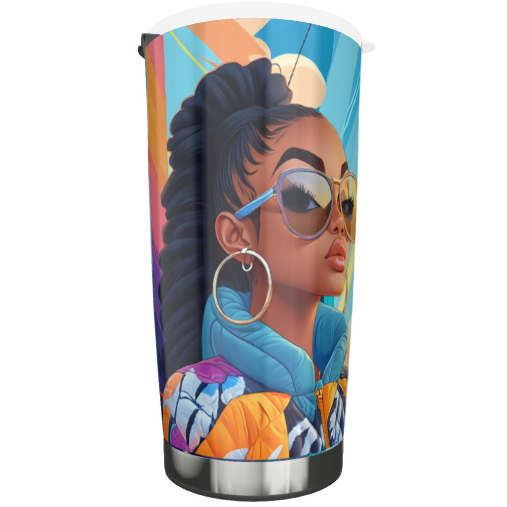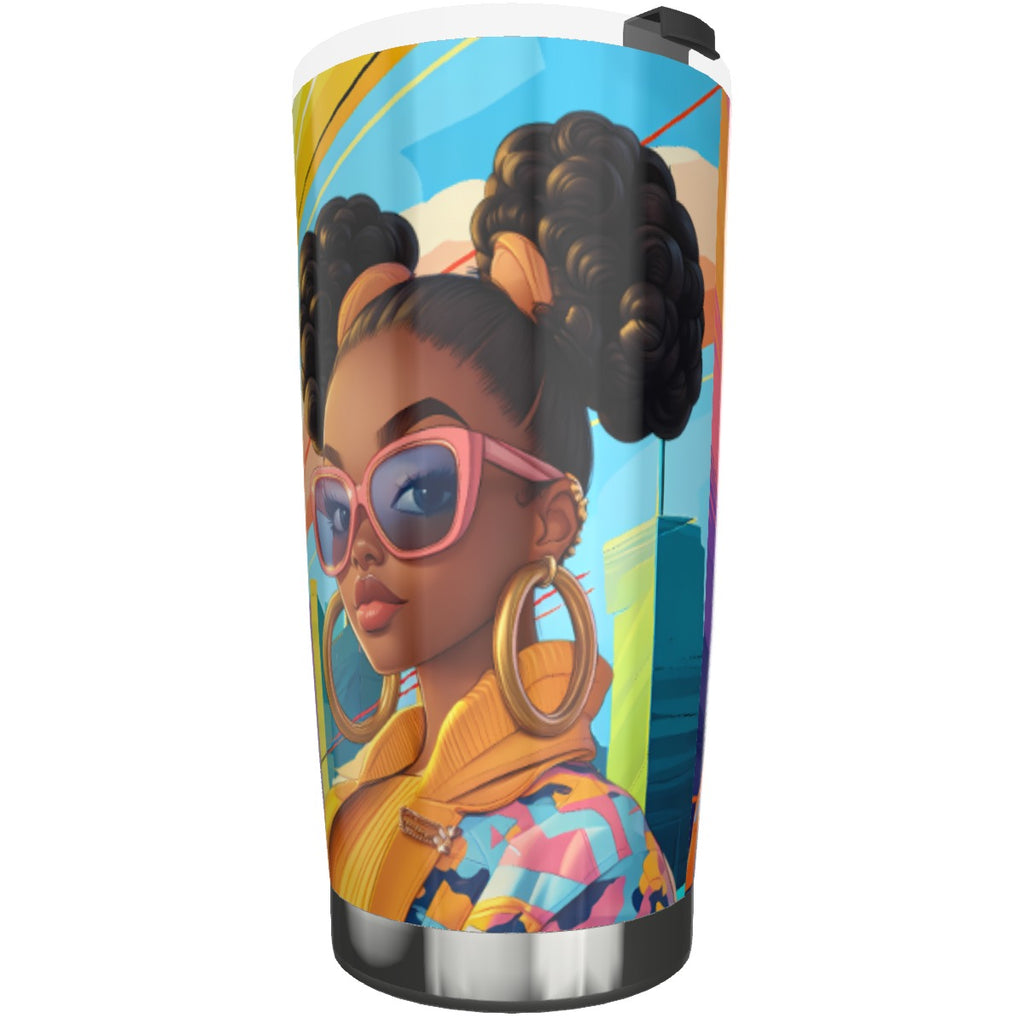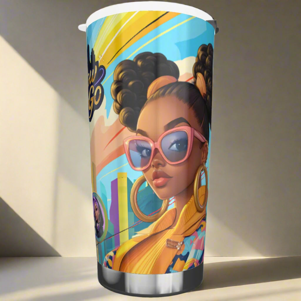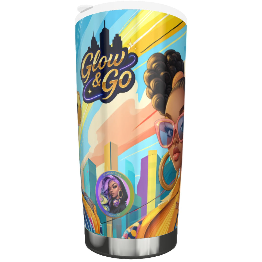 Turn heads and sip in style with the Glow & Go City Glowscape Tumbler. This bold 20oz stainless steel travel cup features vibrant urban art showcasing a confident, fashion-forward Black queen glowing against a radiant cityscape. Wrapped in electric hues of orange, blue, and purple, this tumbler is a walking statement piece for glam girls, boss babes, and streetwear lovers who never dim their shine.