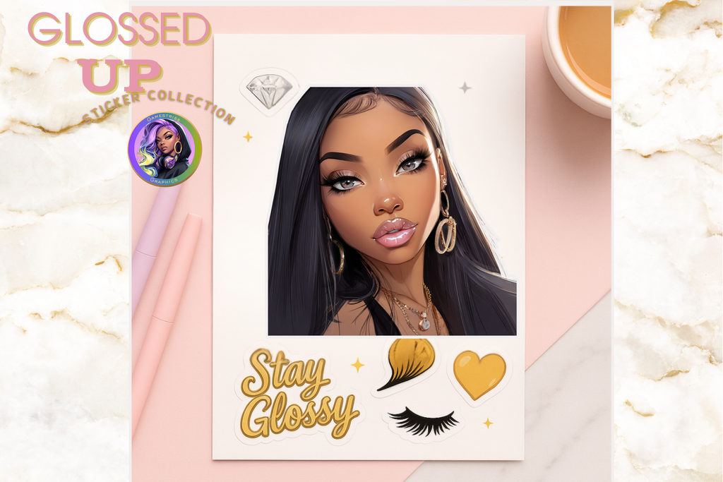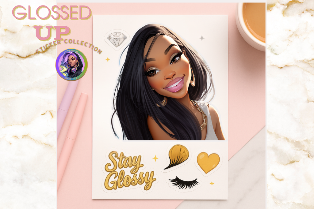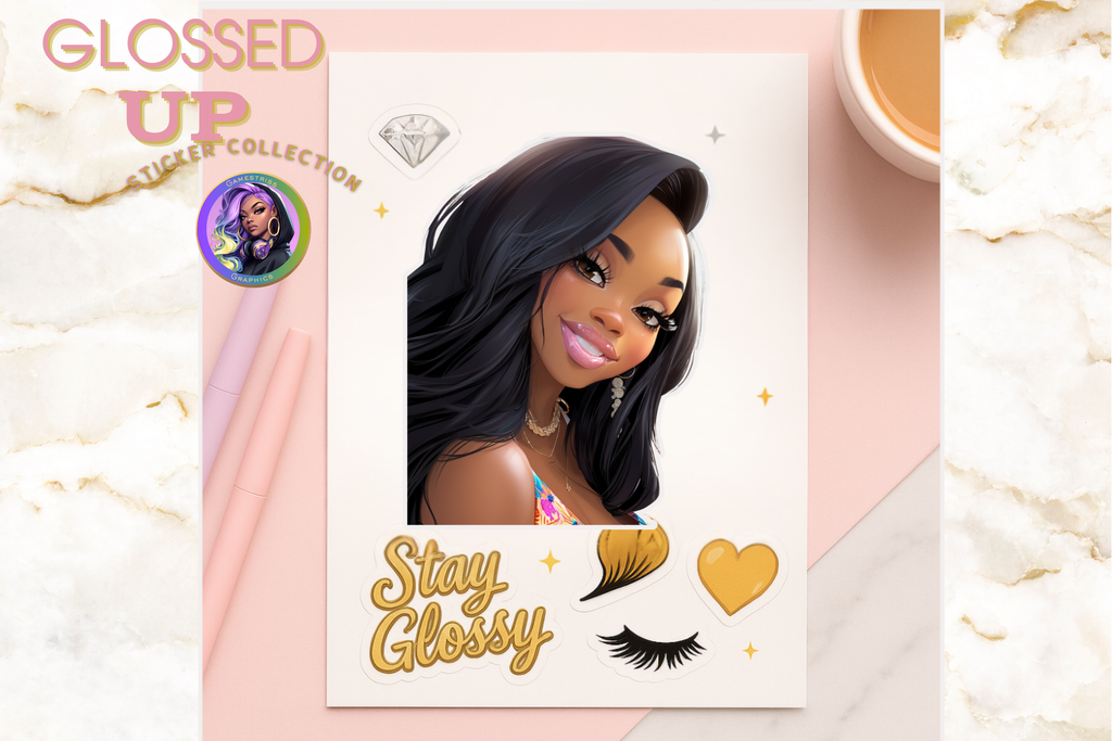 Elevate your style with the Glossed Up Sticker Collection—a daring digital bundle packed with glossy, high-res Black girl art and luxe gold accents. Featuring bold designs like shimmering lashes, hearts, and the powerful “Stay Glossy” phrase, these stickers add fierce flair to your planners, laptops, water bottles, and creative projects. With 5 ready-to-use PNG files optimized for Cricut and Silhouette machines, customizing your gear has never been easier or more glamorous. Unleash your boldness and let your creativity shine with this must-have sticker set.