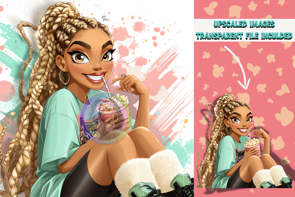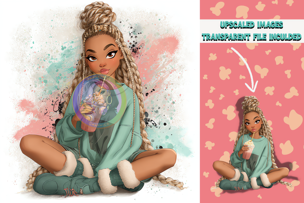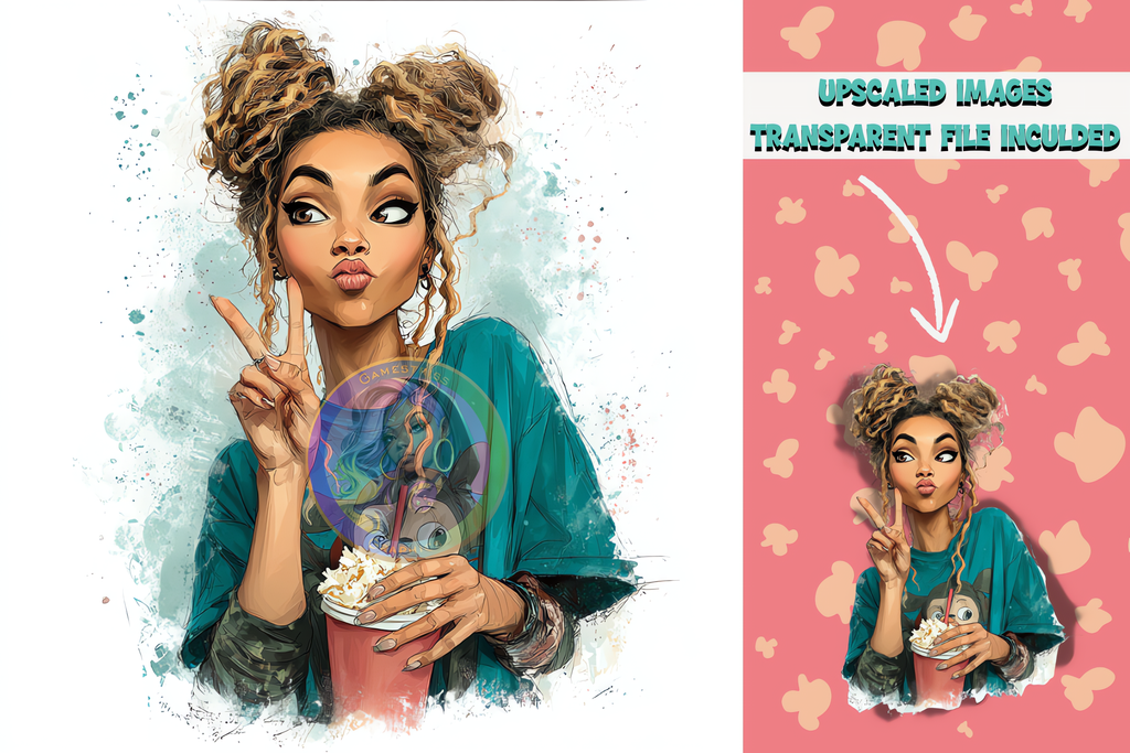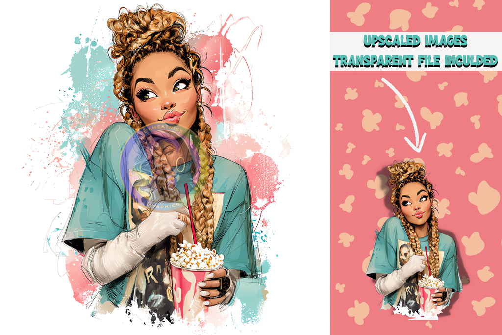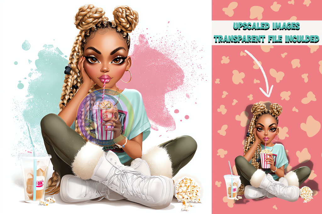 Get ready to kick back in style with the Popcorn & Chill Queens Digital Art Bundle! Perfect for creators, designers, and all-day snack lovers, this bundle celebrates unapologetic Black girl magic and cozy vibes. Each queen in this collection is serving confident energy, rocking cute pajamas, luxe hairstyles, and that effortlessly fly popcorn-in-hand attitude.