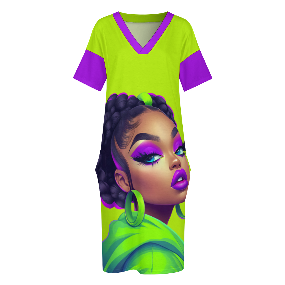 Gamestriss Girl Women's V-neck Loose Dress Fashion Skirts with Pockets
