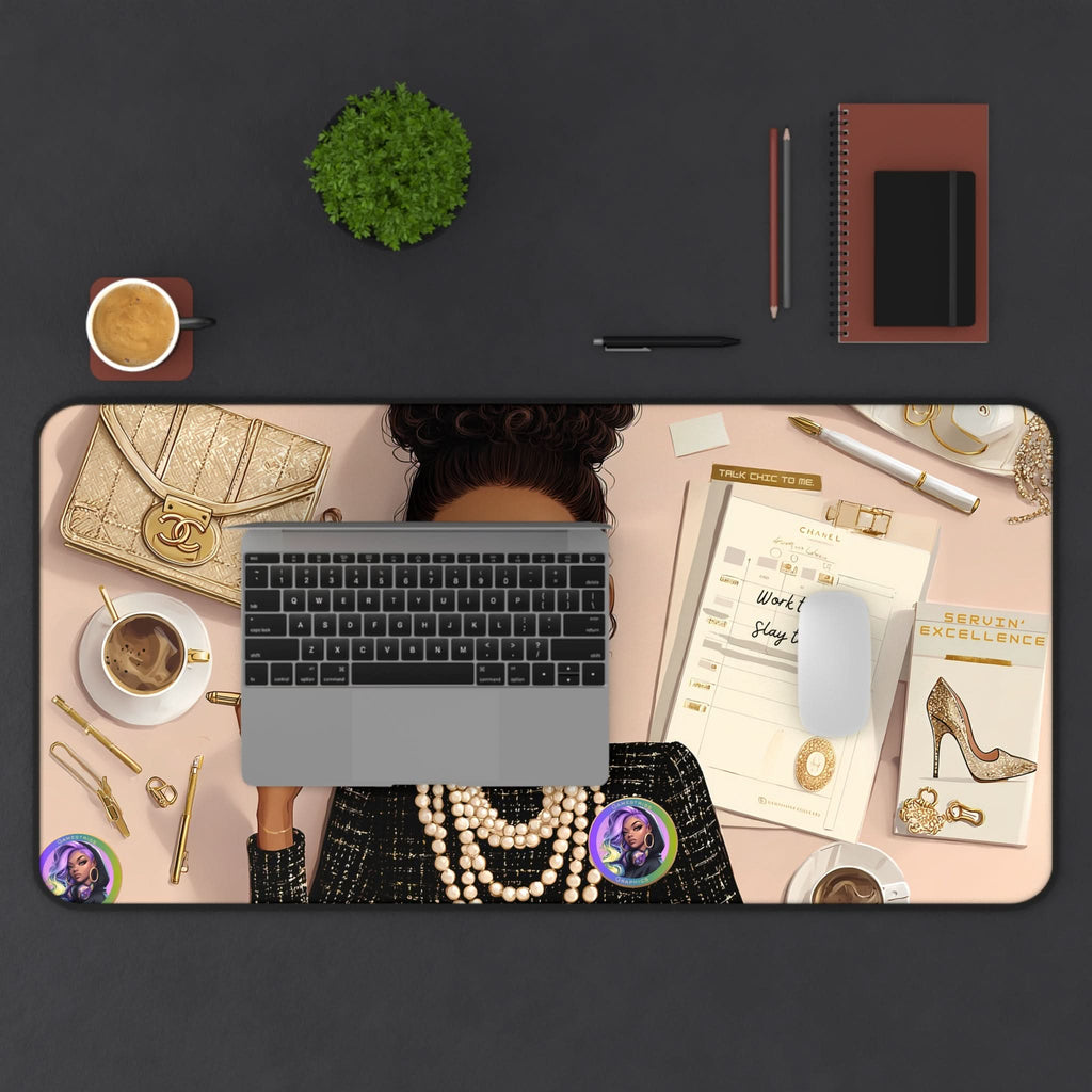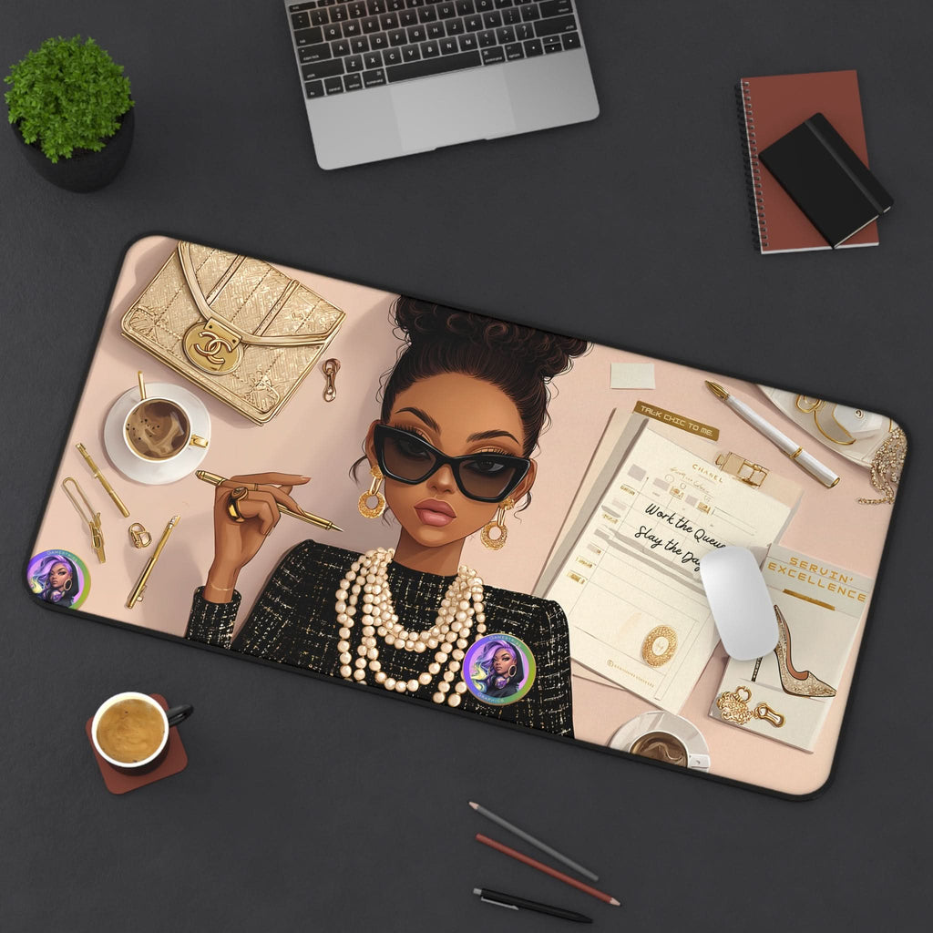Step into your CEO era with the Servin’ Excellence Desk Mat & Mousepad—the ultimate statement piece for glam go-getters, power planners, and boss babes who mean business. Featuring a bold Black woman dripping in pearls and confidence, this luxe desk mat inspires excellence with every task.