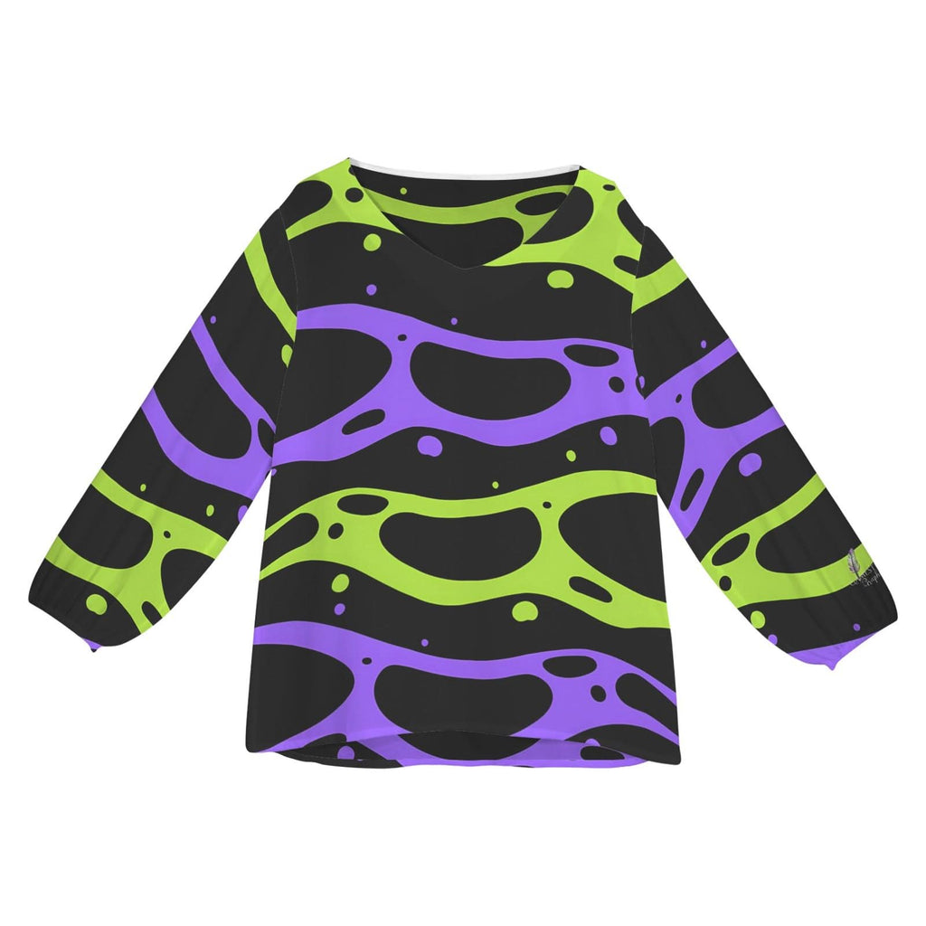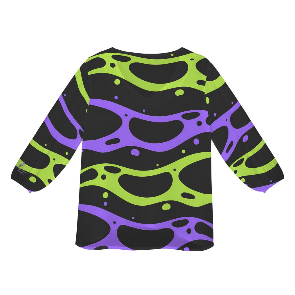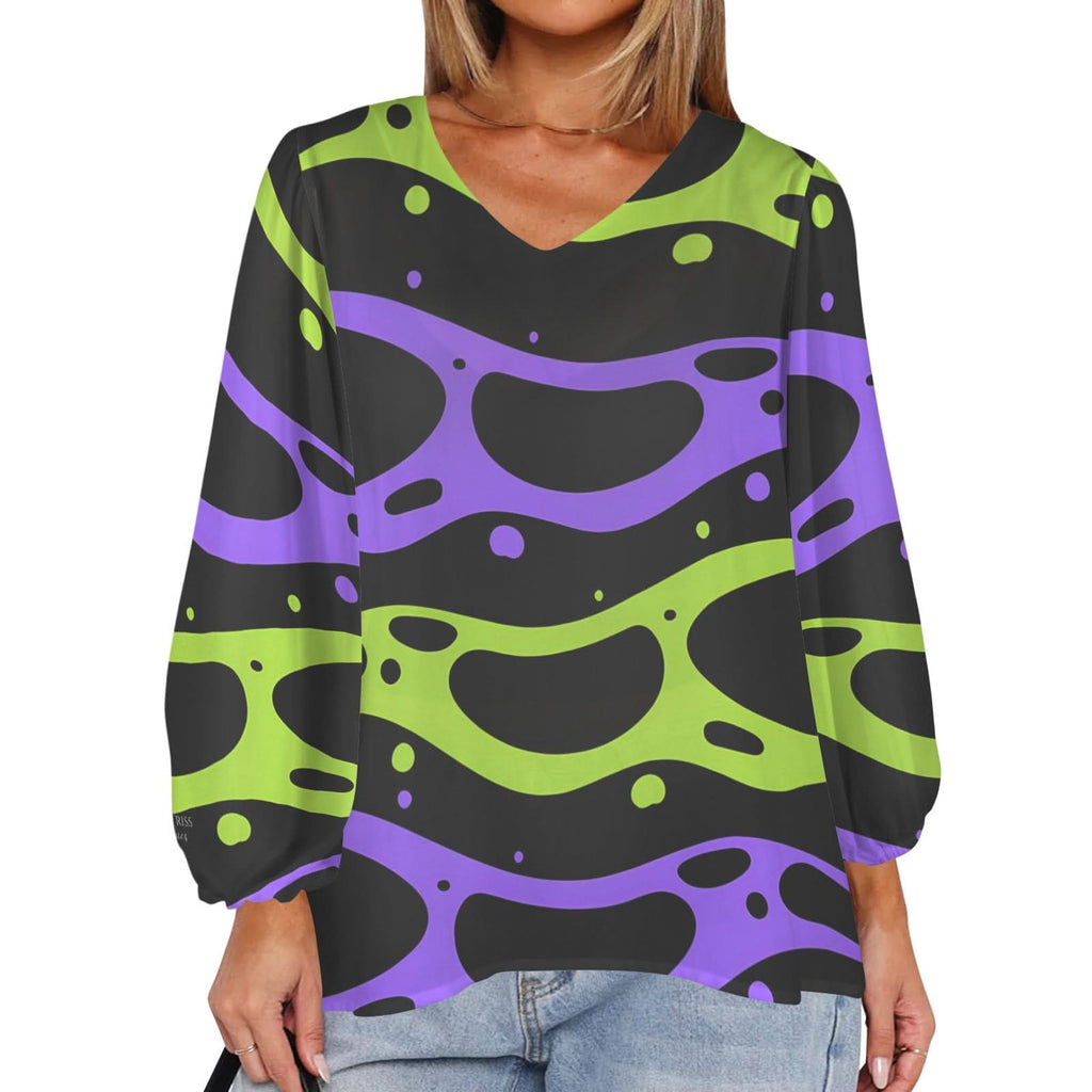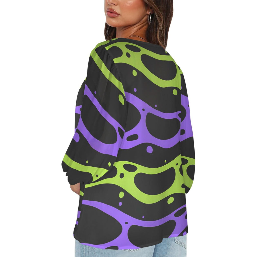 Turn heads and serve looks in the Bold Flow Luxe Blouse – a statement piece for the unapologetically stylish. Featuring an exclusive abstract wave print in vivid lime green and electric purple against a sleek black backdrop, this blouse is made for confident baddies who love bold fashion. The relaxed fit and v-neck cut flatter every curve, while the lightweight fabric keeps things comfy and cool. Perfect with distressed jeans, heels, or your favorite accessories, this top transitions effortlessly from streetwear to chic night-out glam.