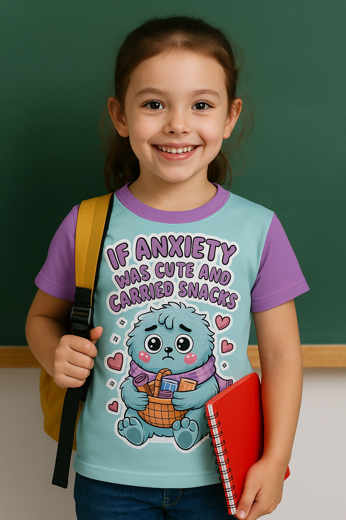 Make back-to-school feel safe, stylish, and a little silly with our If Anxiety Was Cute and Carried Snacks Children’s Short Sleeve Cotton T-Shirt! Featuring a soft pastel palette and an irresistibly adorable snack-holding fuzzy character, this tee delivers cozy comfort with a message kids can relate to. Whether your little one is tackling first-day jitters or just wants to express their personality, this shirt is the perfect blend of cute and comforting. Made from breathable, 100% cotton fabric, it’s gentle on skin and strong enough for every adventure.